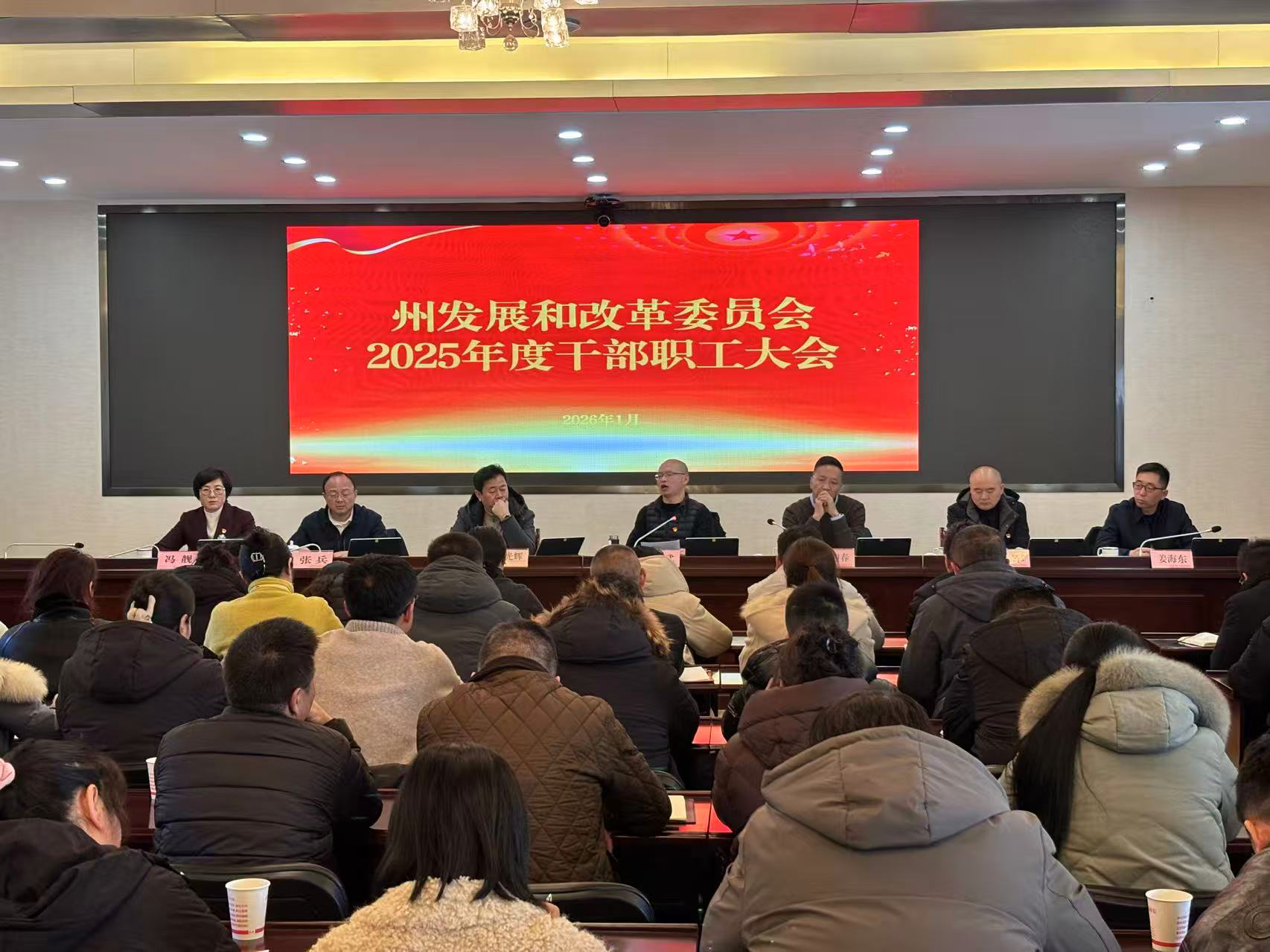 2026年1月12日,甘孜州发展和改革委员会召开干部职工大会,传达贯彻州委、州政府近期安排部署和最新工作要求,全面总结2025年和“十四五”期州发展改革各项工作,安排部署2026年重点工作任务。州发展改革委党组书记、主任周世武出席会议并讲话,委全体班子成员参加会议。